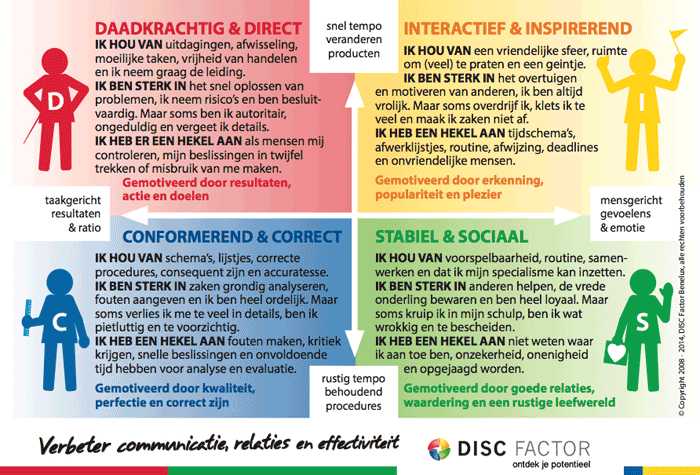 Hoe mensen gemotiveerd worden is een heel belangrijk onderdeel van DISC. Mensen worden namelijk gemotiveerd om hun eigen redenen en overtuigingen en niet in de eerste plaats vanwege iemand anders. Het DISC-model helpt om de eigen behoeften en die van anderen beter te begrijpen.